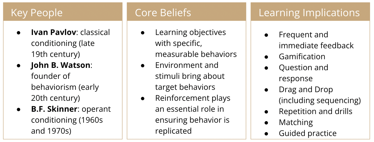 Behaviorism is an important learning theory that still has its place in education, corporate training, and any space where learners need to demonstrate target behaviors or learn skills and procedures that require memorization and recall. While it may receive criticism for not analyzing a learner’s internal thinking or making learning a social activity, its emphasis on frequent feedback and clear, measurable objectives provide instructional designers important tools that they can incorporate into their instructional materials.